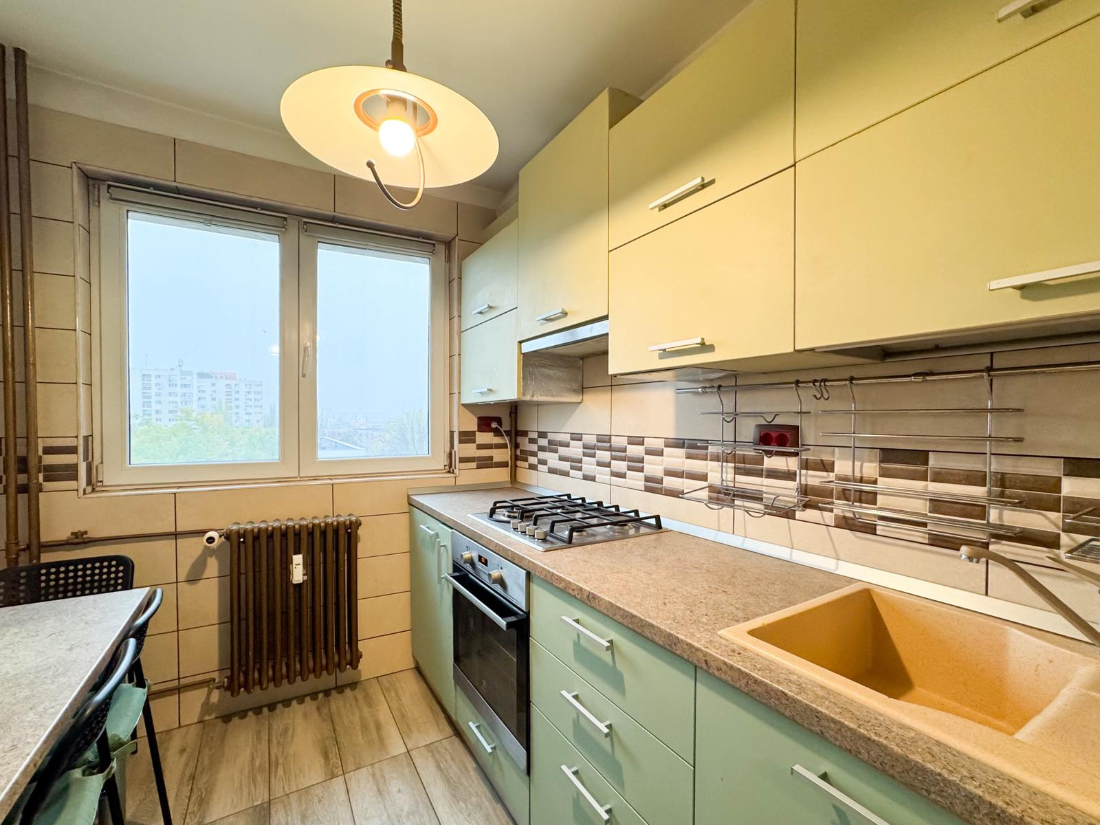 Mobilare, utilare: bucatarie complet mobilata, utilata cu cuptor, plita, combina frigorifica. Masina de spalat in nisa din holul de langa baie. Dormitor mobilat cu pat cu noptiere si sifonier masiv. Dulap de haine in holul de intrare. Canapea textil, birou, scaun birou in sufragerie. Aparat aer conditionat in sufragerie.