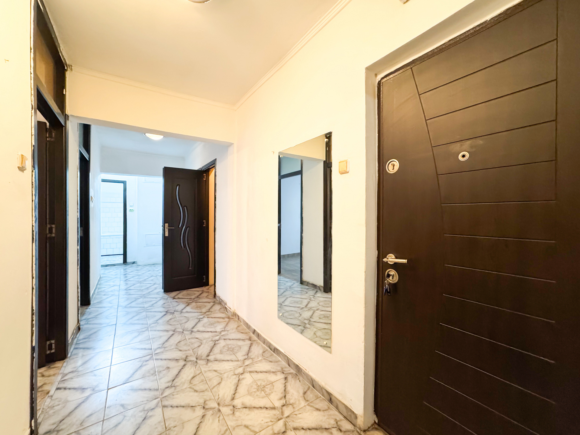 Decomandat. Impartire buna, cu sufragerie generoasa, bucatarie mare, cu debara pe pozitie, dormitoare aproximativ egale si un hol mare, lat, pe care "se intind" toate camerele. Si e un hol lat, cei care cunosc zona stiu ca sunt doua tipuri de apartamente, unul cu hol ingust si acestea, cu holul lat.