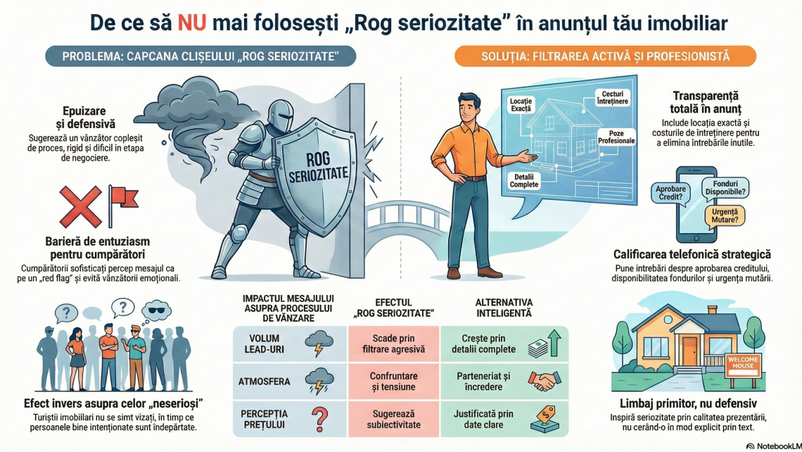 Ironia situației: Cei cu adevărat „neserioși” (turiștii imobiliari sau agenții care asta au în fișa postului — să sune și să obțină detalii) oricum nu se simt vizați. Ei vor suna oricum. Mesajul îi îndepărtează doar pe cei timizi sau pe cei care caută o colaborare armonioasă.